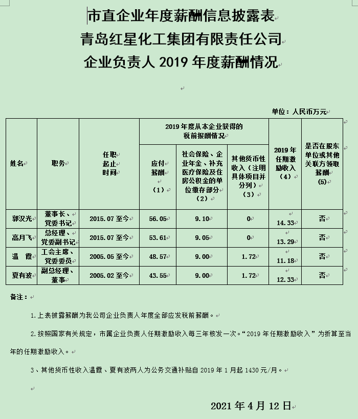 【概(gai)要描述(shu)】青島紅(hong)星化工集團有限(xian)責(ze)任公(gong)司企業(ye)負責(ze)人2019年度薪酬情(qing)況信息披露